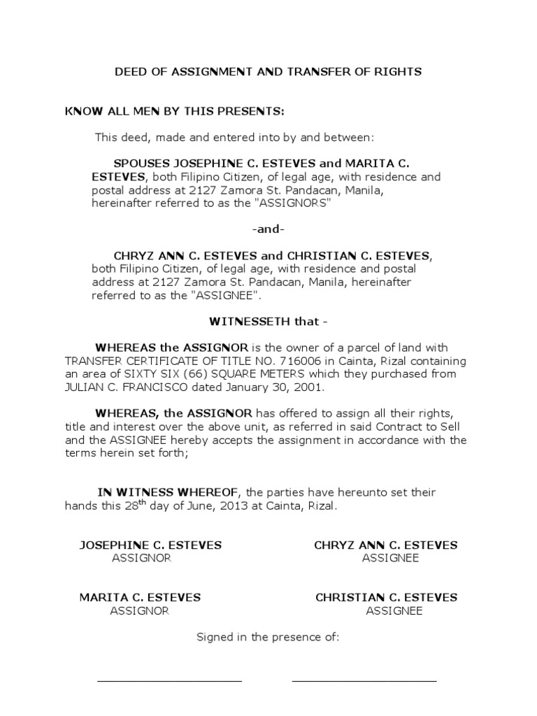 If you have a land and no deed yet, i feel sorry for you! <name of participant as in nric/fin> witness (participant's parent or legal guardian) name: Before embarking on the discovery of how assignments in insurance law can be legally effected, it may prove beneficial. The deed of assignment is just one of the many legal documents you need to sign if you're buying or selling a property. La ferme des animaux resume de la fin.