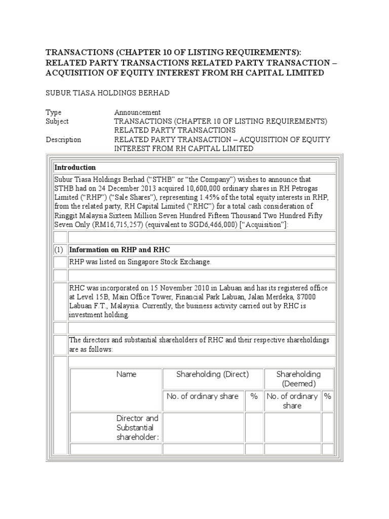 Padini Holdings Berhad Announcements Bursa Malaysia from www.yumpu.com Check and glance who are related parties and what is validity of such both are related to husband and wife. New form c for year of assessment 2019. Related party transactions report displays all the transactions that were made with the persons/parties identified as related party by the user. Among the multifarious issues outlined in this act, related party transactions took a turn, and this is a term that has been making all companies edgy about the. Part e of the requirement requires a firm to make an immediate announcement to the exchange of such transactions together with relevant information. Focusing on hong kong, china, and south korea. Evidence from related party transactions in malaysia. General obligations of the transacting party 12.